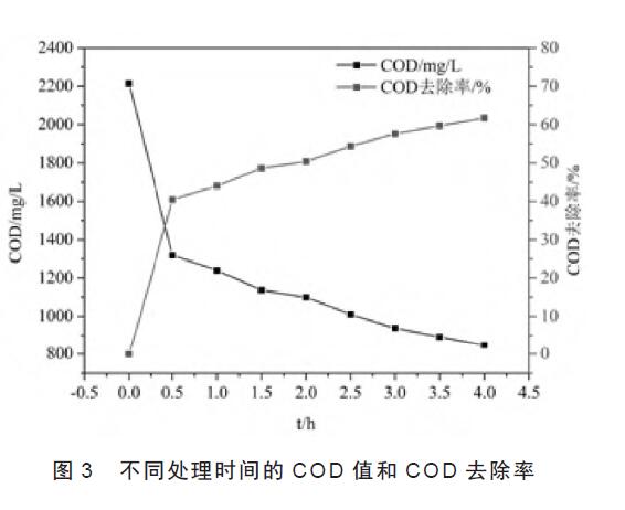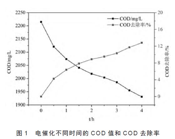 利用電催化處理該印染廢水,其結果見圖1。從圖1 中可以看出,隨著電解時間的延長,COD 值逐漸減小,但是COD 的去除率不大,到第4 h 時,COD 的去除率為12.82%,對應的COD 值為1 931mg/L,表明電催化法去除該印染廢水中的COD 效果不佳,分析原因可能是該廢水的pH 為強堿性,不利于電催化產生強氧化性的•OH。