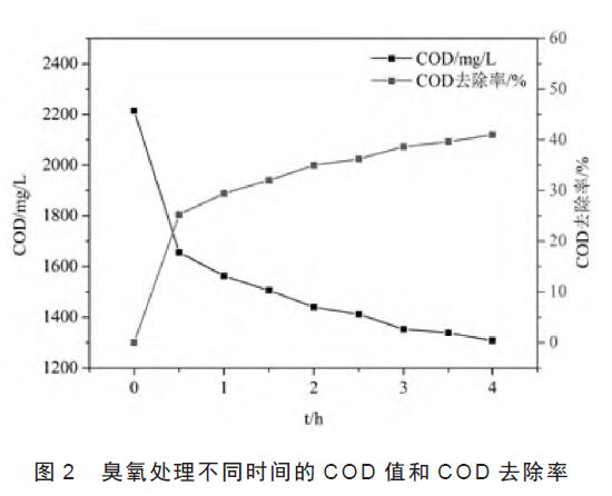利用臭氧氧化技術處理該印染廢水,其結果見圖2。從圖2 中可以看出,隨著氧化時間的延長,COD 值逐漸減小。第1 h 時,COD 的去除率達到29.43%,到第4 h 時,COD 的去除率為40.98%,對應的COD 值為1 308 mg/L,表明臭氧氧化法該印染廢水中的COD 的去除具有一定的效果,分析原因是堿性條件下,臭氧分解快,羥基自由基氧化作用大,COD 的去除率增加。