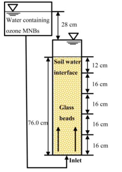在內(nèi)徑為12 cm 的有機(jī)玻璃圓筒(圖1)中進(jìn)行了柱測試, 以研究臭氧MNB處理受有機(jī)物污染的地下水。將玻璃珠與甲基橙溶液以10 mg / L的初始濃度混合,以模擬被有機(jī)物污染的土壤和地下水。的比重的玻璃珠是2.43,平均直徑為60微米,干密度為1.43 克/厘米3 。的水力傳導(dǎo)率為1.3 × 10 -4米/秒,因?yàn)椴Aе檫M(jìn)行分級很差,其表示介質(zhì)的沙子。土壤樣品的高度為76 分別在距底部16 厘米,32 厘米,48 厘米和64 厘米處分布有4個采樣口#1,#2,#3和#4 。去離子水中不斷產(chǎn)生臭氧MNB,以確保臭氧MNB的數(shù)量保持在峰值。含有臭氧的MNB的水從底部以0.368 的水力梯度i向上供入塔中。不使用MNB的去離子水用于對比測試。每個測試進(jìn)行兩次以確保數(shù)據(jù)的可重復(fù)性。