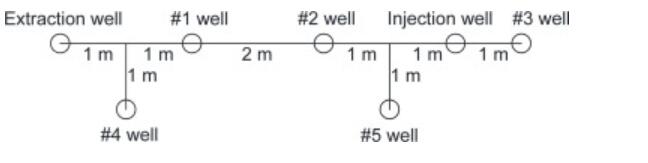 一臺抽采井,一臺注入井和五個監(jiān)控井(其位置如圖2所示)用于原位修復(fù)。 很初的地下水流向是從注入井到提取井。每個井的深度為16 m,篩選間隔為12 m至16 m。提取井的直徑為25 cm,將提取速率為36 L / min 的泵放置在井內(nèi)15 m 的深度處。注入井和監(jiān)測井的直徑為5 厘米。注入井與注入單元相連,注入率為15 升/分鐘 由于注入速率受場地和設(shè)施條件的限制,因此采用了較高的抽取速率以產(chǎn)生更強(qiáng)的地下水流。處理殘留的水并將其排放到遠(yuǎn)離測試區(qū)域的地方。在監(jiān)測井中安裝了地下水采樣器,以收集15 m 深度的樣品。