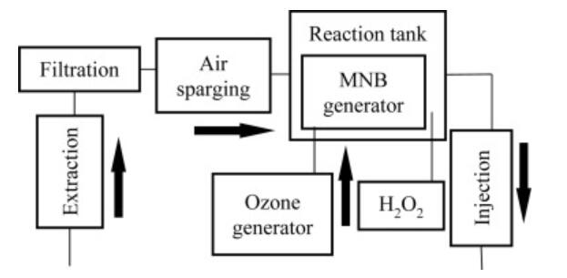 開發(fā)了現(xiàn)場修復(fù)設(shè)備(圖3 )用于現(xiàn)場測試。修復(fù)系統(tǒng)包含三個部分:提取單元,反應(yīng)單元和注射單元。從該地點(diǎn)提取受污染的地下水,并進(jìn)行過濾以除去土壤顆粒。過濾后,用空氣噴射裝置處理地下水以除去三氯乙烯。隨后,將處理過的地下水注入到反應(yīng)罐中。MNB發(fā)生器位于水箱內(nèi)部,用于原位產(chǎn)生臭氧MNB。在產(chǎn)生臭氧MNB的過程中,以1∶1的臭氧∶H 2 O 2的質(zhì)量比添加H 2 O 2試劑。臭氧MNB和H 2 O之后添加2份水,通過注入單元將水注入地面。從反應(yīng)罐到進(jìn)樣單元的流量為15 L / min,停留時間為33.3 min,以實(shí)現(xiàn) 很佳的MNB生成。從當(dāng)?shù)貢r間每天09:00到18:00進(jìn)行了六天的原位地下水修復(fù)。對地下水進(jìn)行采樣以監(jiān)測三氯乙烯的濃度。