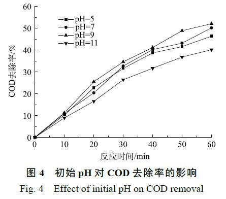 當(dāng)廢水 pH 進(jìn)一步升高至 11 時(shí),COD 的去除率下降至 40.2%,這可能是因?yàn)槌粞醮呋瘎┑牧汶姾牲c(diǎn) 在 pH=9 附近,酸性或過堿性條件都影響了催化劑表面羥基的電荷形態(tài)[20]。此外,由于 pH 的升高,導(dǎo)致羥基自由基的淬滅速率提高,降低了與有機(jī)物的接觸概率,導(dǎo)致 COD 去除率的降低[21]。