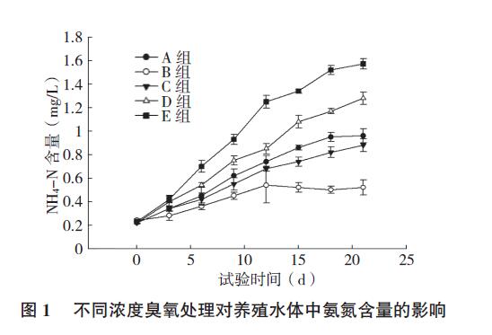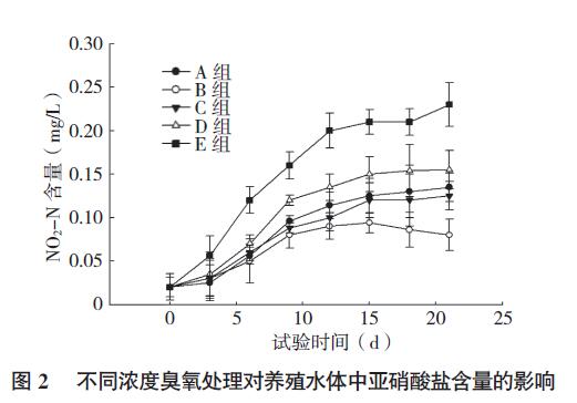 由圖1、圖2 可知,各組水體氨氮和亞硝酸鹽含量都呈上升趨勢。與對照組(E 組)相比,經(jīng)過臭氧處理水體中的氨氮和亞硝酸鹽含量上升緩慢,可見臭氧對水體中的氨氮和亞硝酸有明顯的降解效果。B 組(0.1 mg/L 臭氧)水體的氨氮和亞硝酸鹽含量顯著低于其他幾組,而A 組(0.05 mg/L 臭氧)水體的氨氮含量和亞硝酸鹽含量雖然與C 組(0.15 mg/L 臭氧)相比差異不顯著,但高于C 組。可見,較低濃度臭氧對水體中氨氮和亞硝酸鹽降解效果不顯著,但其濃度也不是越高越好。