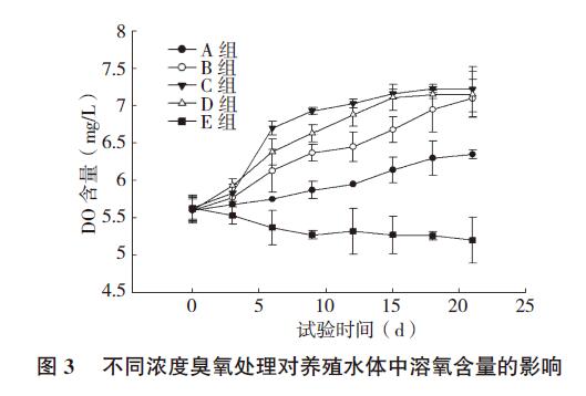 由溶氧含量結(jié)果(圖3)可知,使用臭氧處理育苗水體可以明顯提高水體中的溶氧含量,隨著臭氧濃度的增加,水體中的溶氧含量也不斷增加。D組水體溶氧含量略低于C 組,說明臭氧雖然能提高水體中的溶氧含量,但若濃度太高,則水體中的殘留就會增加,且會產(chǎn)生氧化性副產(chǎn)物,對水生生物造成毒害,影響生產(chǎn)養(yǎng)殖的順利進(jìn)行。