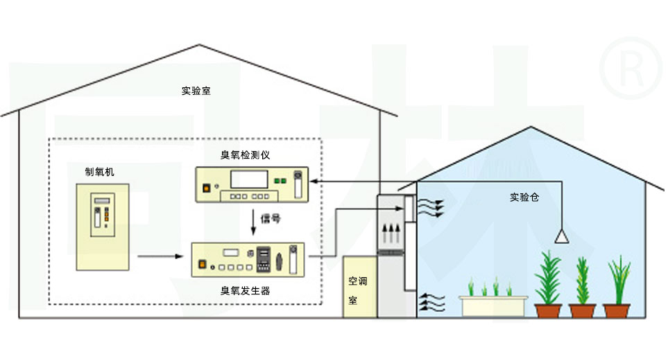 這是一個臭氧暴露系統(tǒng)的例子,用于測試臭氧對植物和其他植物的影響,使用現(xiàn)有的中型腔室(例如,玻璃腔室)。
