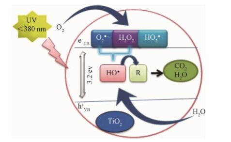 光催化氧化法是在光化學氧化基礎上逐漸發展起來的一種新興的高級氧化技術,這種方法簡單高效,在有機物的降解方面效果更好。TiO2由于具有穩定性好、活性高和無毒性等優點,成為目前應用 很廣泛的催化劑,圖1為二氧化鈦光催化原理示意圖。