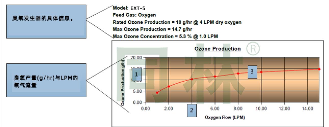 1.     臭氧產量顯示在垂直(Y軸)的圖形上,單位為克/小時或其他臭氧輸出測量單位